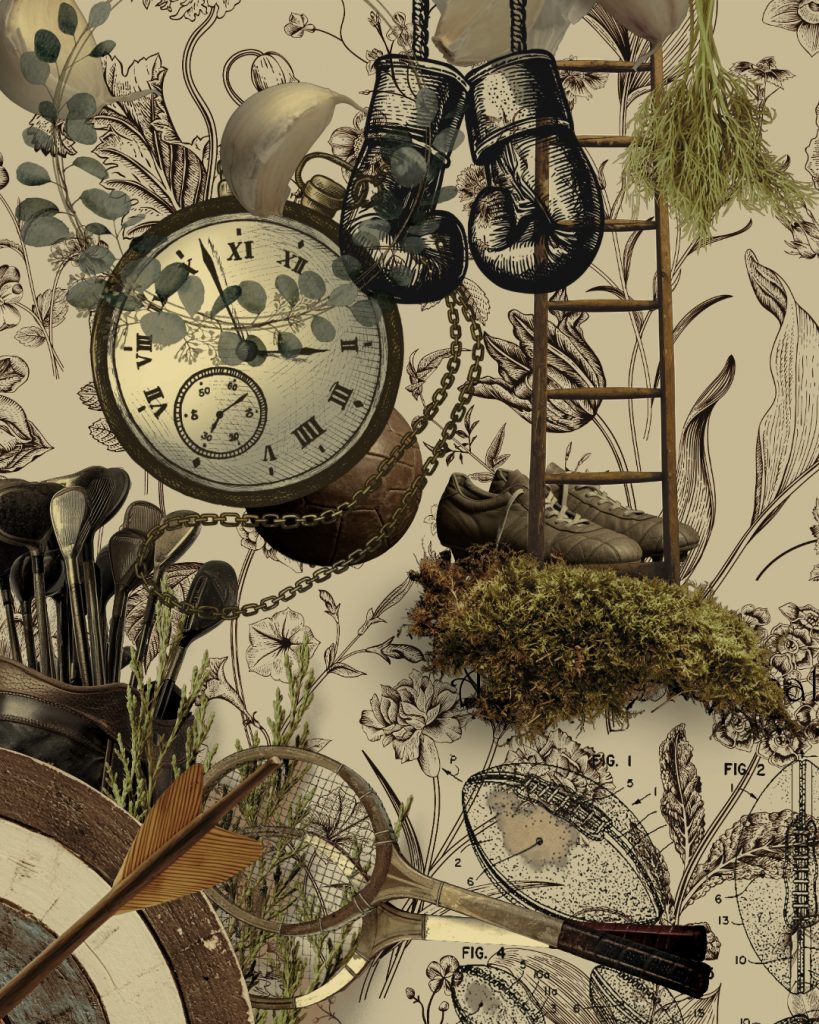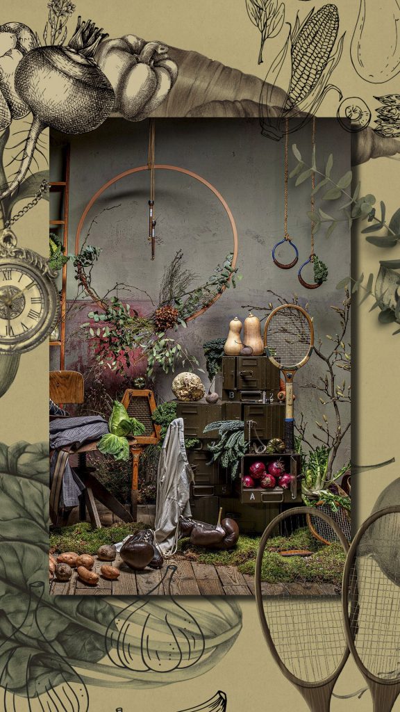 Die verwilderten Requisiten, überwuchert von Moos und Geäst, strahlen eine unheimliche Stille und Verlassenheit aus – Zeugen vergangener Kraft und Energie. Originale Sportgeräte erinnern an Lebensfreude und Beweglichkeit, während üppiges Gemüse, teils in Munitionskisten drapiert ist.